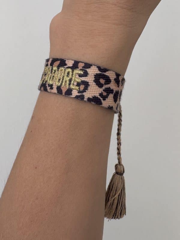 Bracelet rétro à gros maillons travaillés et ciselés en acier inoxydable et ruban de tissus à imprimé léopard