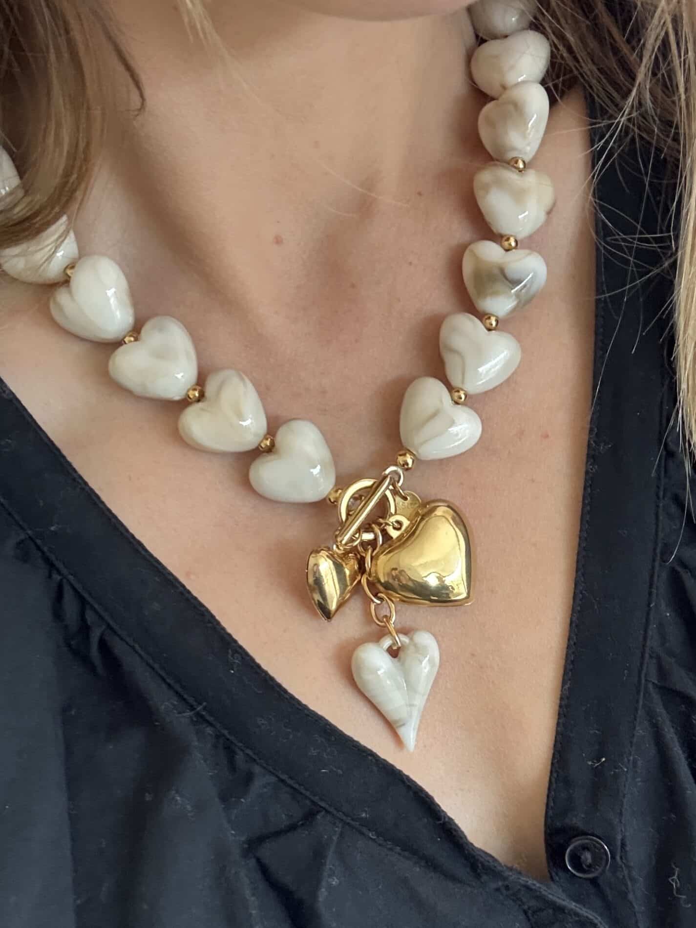 • Promo ! Collier composé d’une succession de coeurs en résine beige avec pampilles en forme de coeurs en résine et acier inoxydable