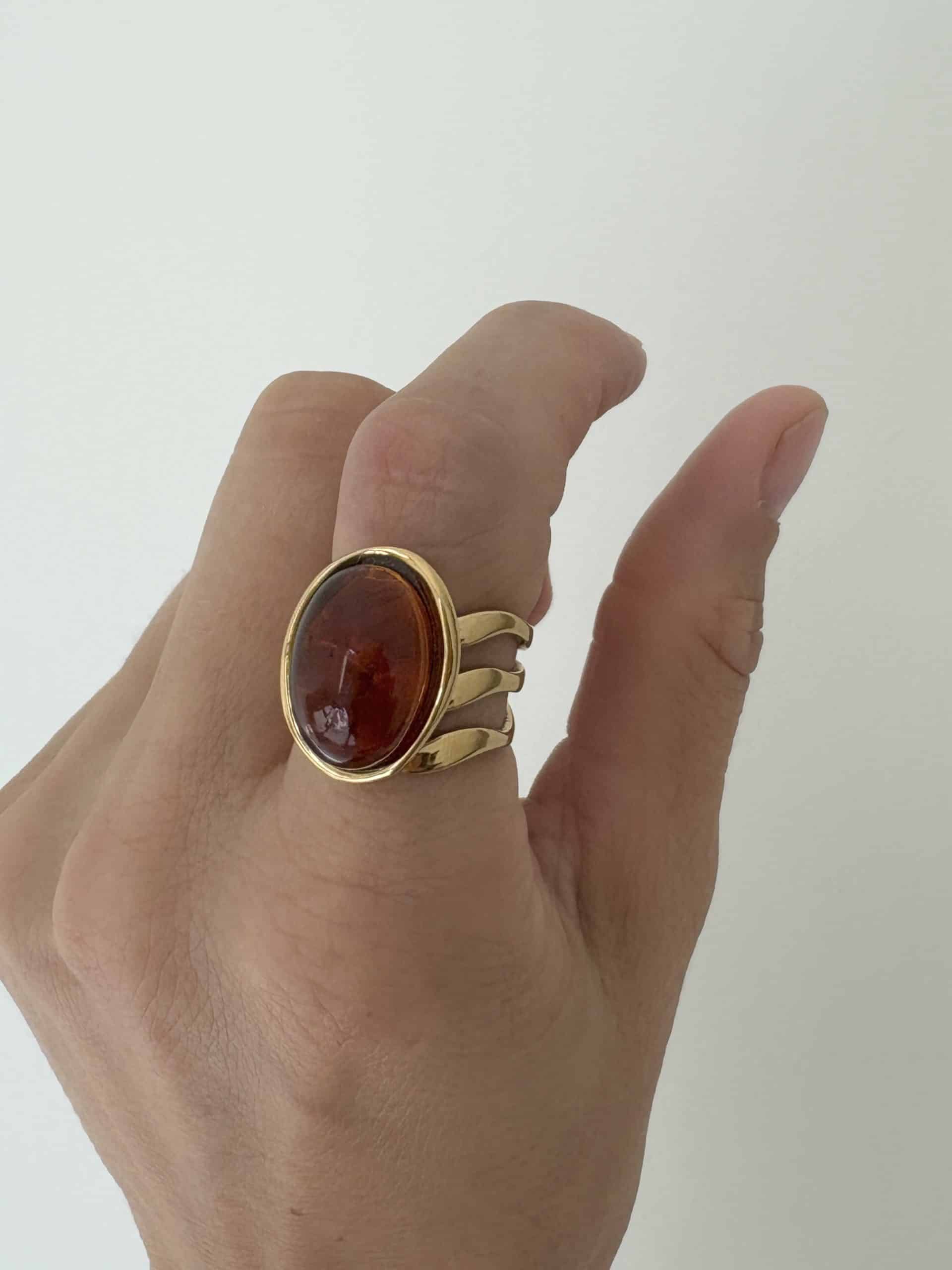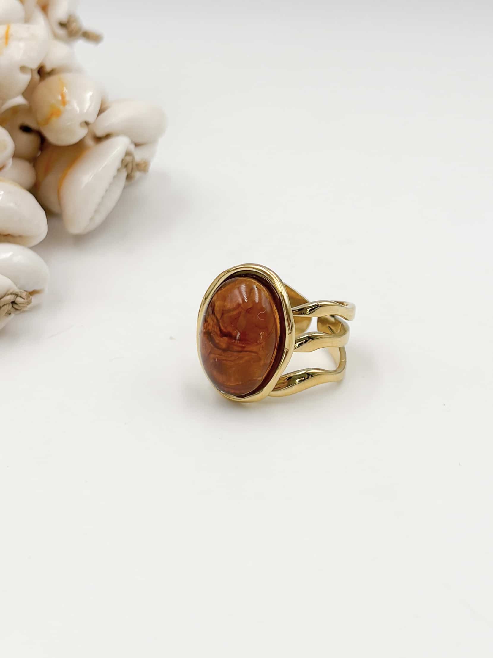 Bague AMBER – Bague large À TROIS ANNEAUX avec centre de couleur ambre – Bijou doré en acier inoxydable