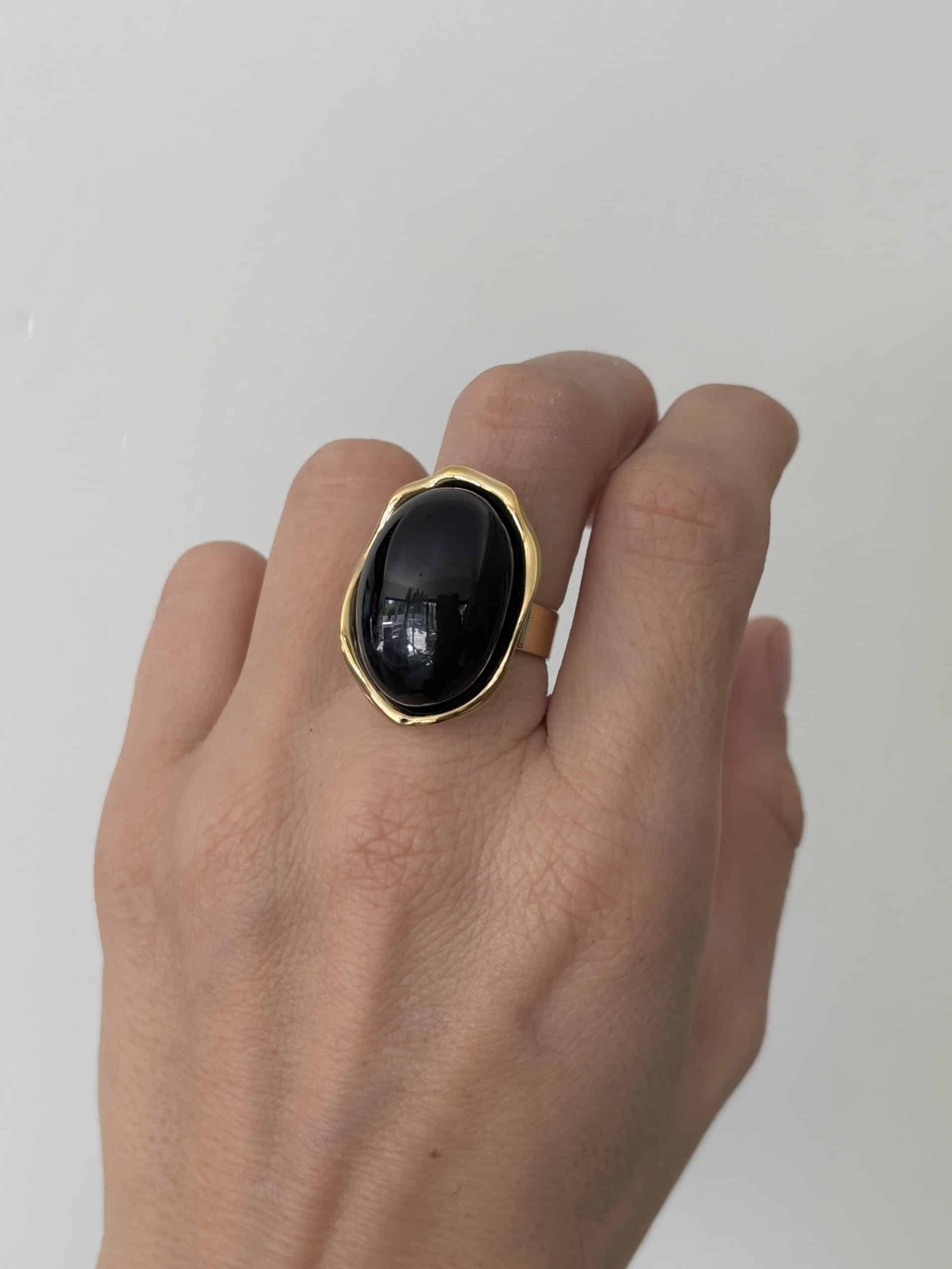 • Bague large  fabriquée en acier inoxydable de couleur dorée. Vous trouverez une pierre naturelle d’onyx en son centre, de couleur noire