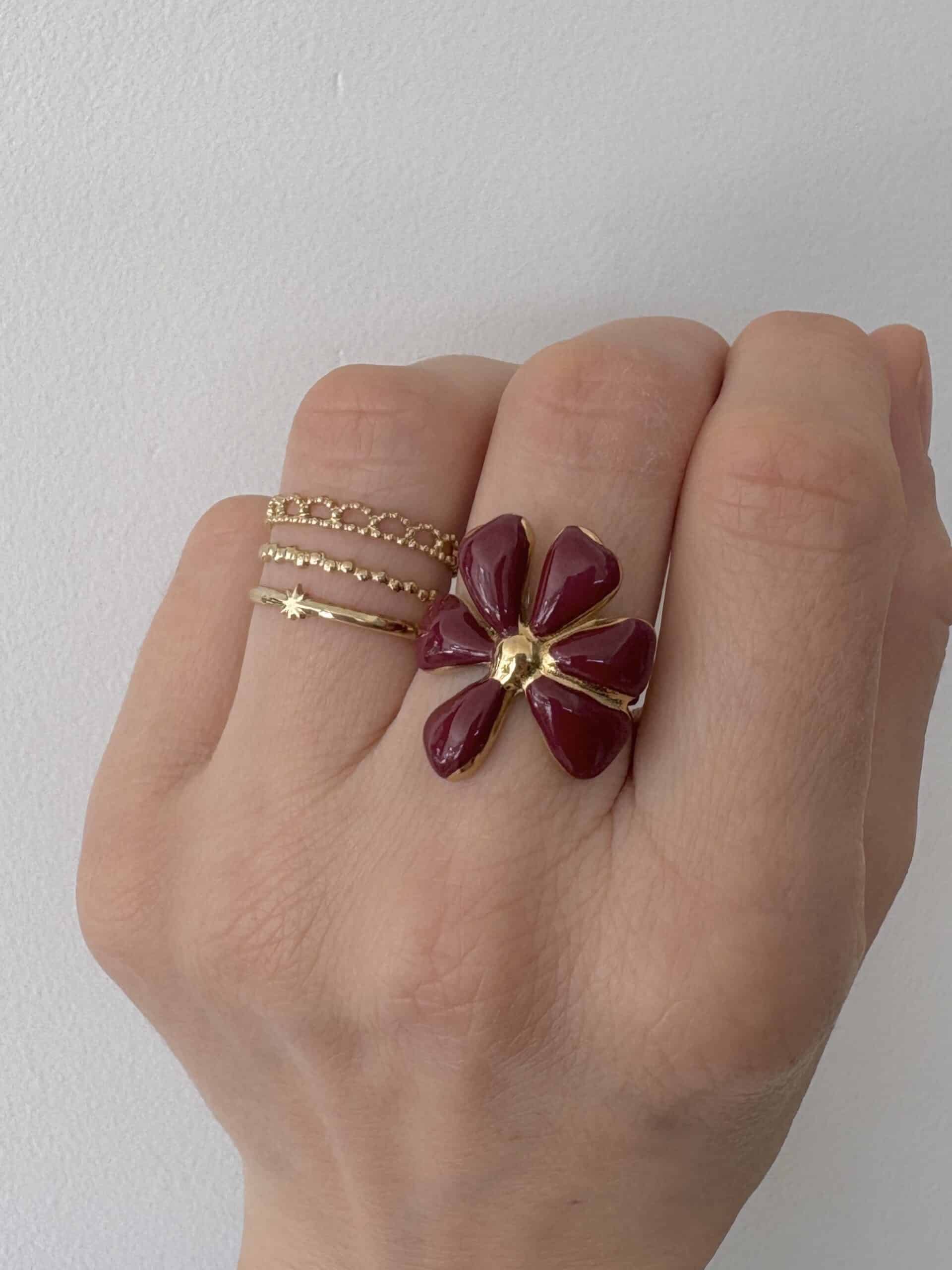 Adoptez cette bague fleur émaillée pour apporter une touche chic, colorée et durable à votre collection de bijoux.