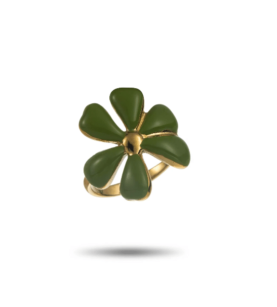 Sa forme de fleur délicatement travaillée apporte une touche romantique et tendance, tandis que son émail vert olive sublime toutes les carnations. Cette bague ajustable se resserre discrètement sur le dessus, juste sous la fleur, garantissant un confort optimal et un ajustement parfait à votre doigt.