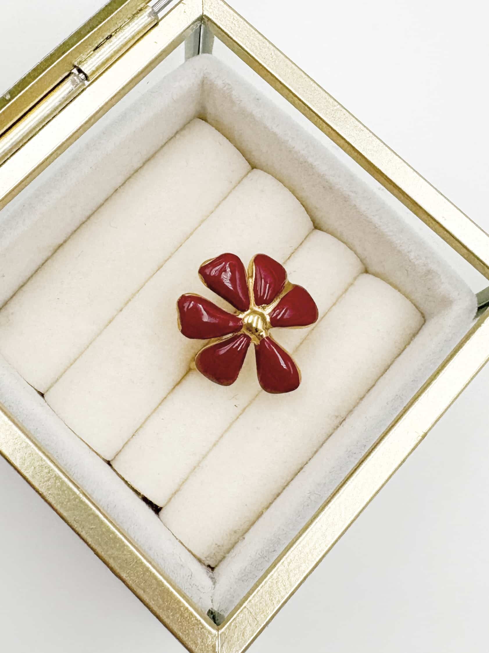 Sa forme de fleur délicatement travaillée apporte une touche romantique et tendance, tandis que son émail bordeaux profond sublime toutes les carnations. Cette bague ajustable se resserre discrètement sur le dessus, juste sous la fleur, garantissant un confort optimal et un ajustement parfait à votre doigt.