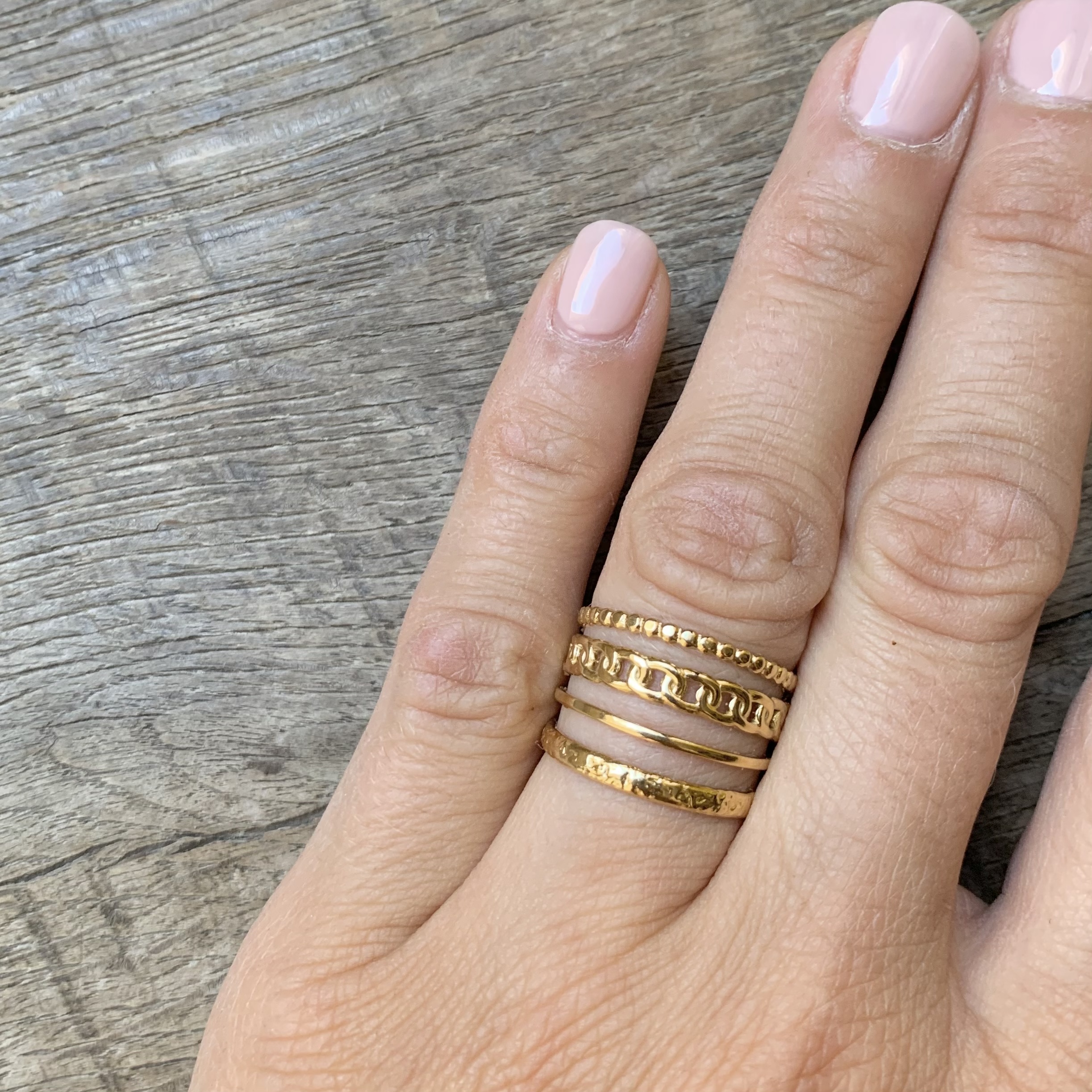 Ce bijou est composé de quatre anneaux travaillés: un anneau très fin, un anneau martelé, un anneau à maillon chaine et un maillon travaillé de petites billes d’acier inoxydable