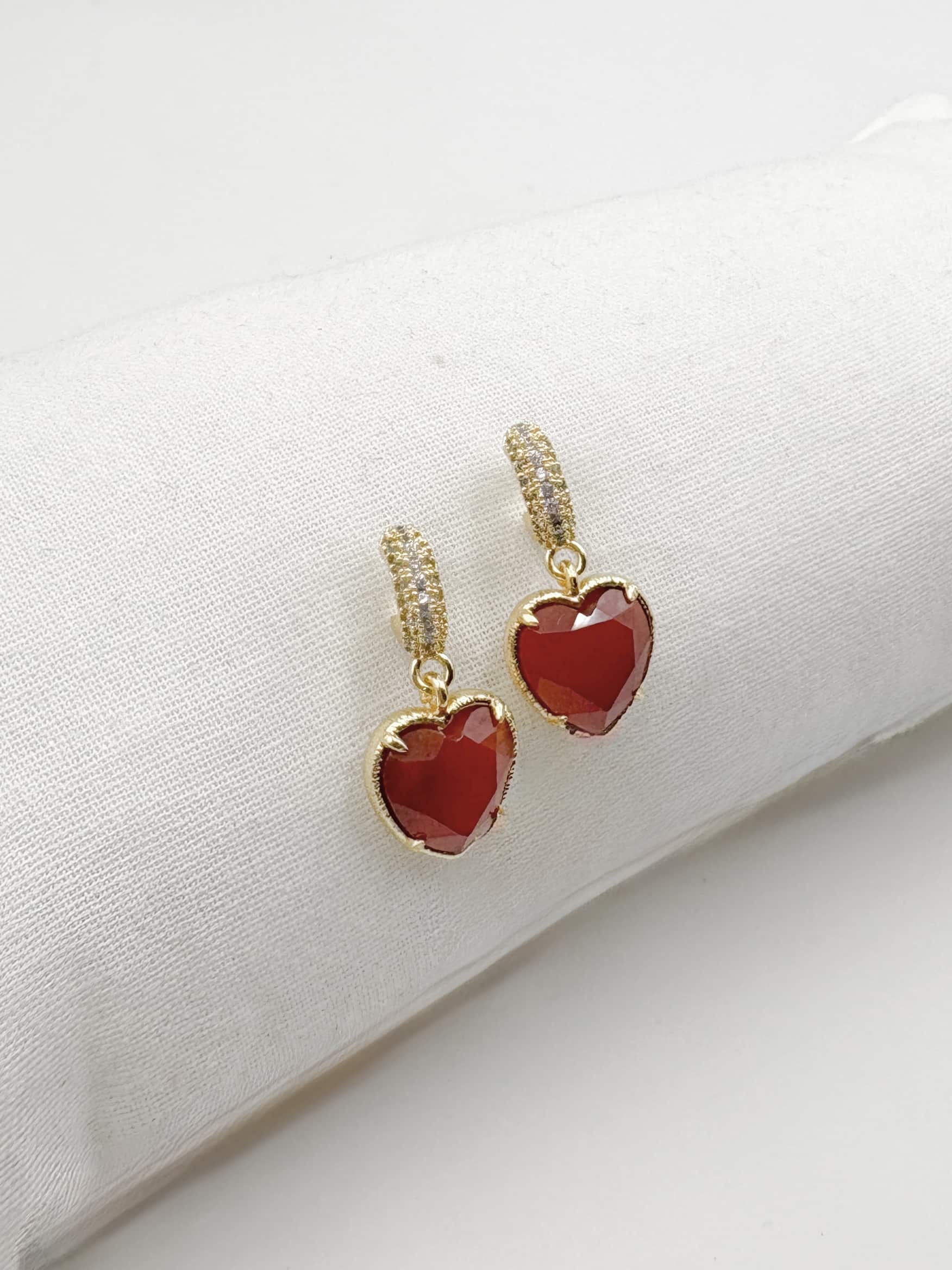 Boucles d’oreilles créoles ouvertes serties de strass blancs et cœur en cornaline naturelle