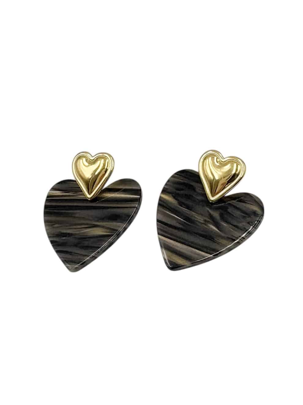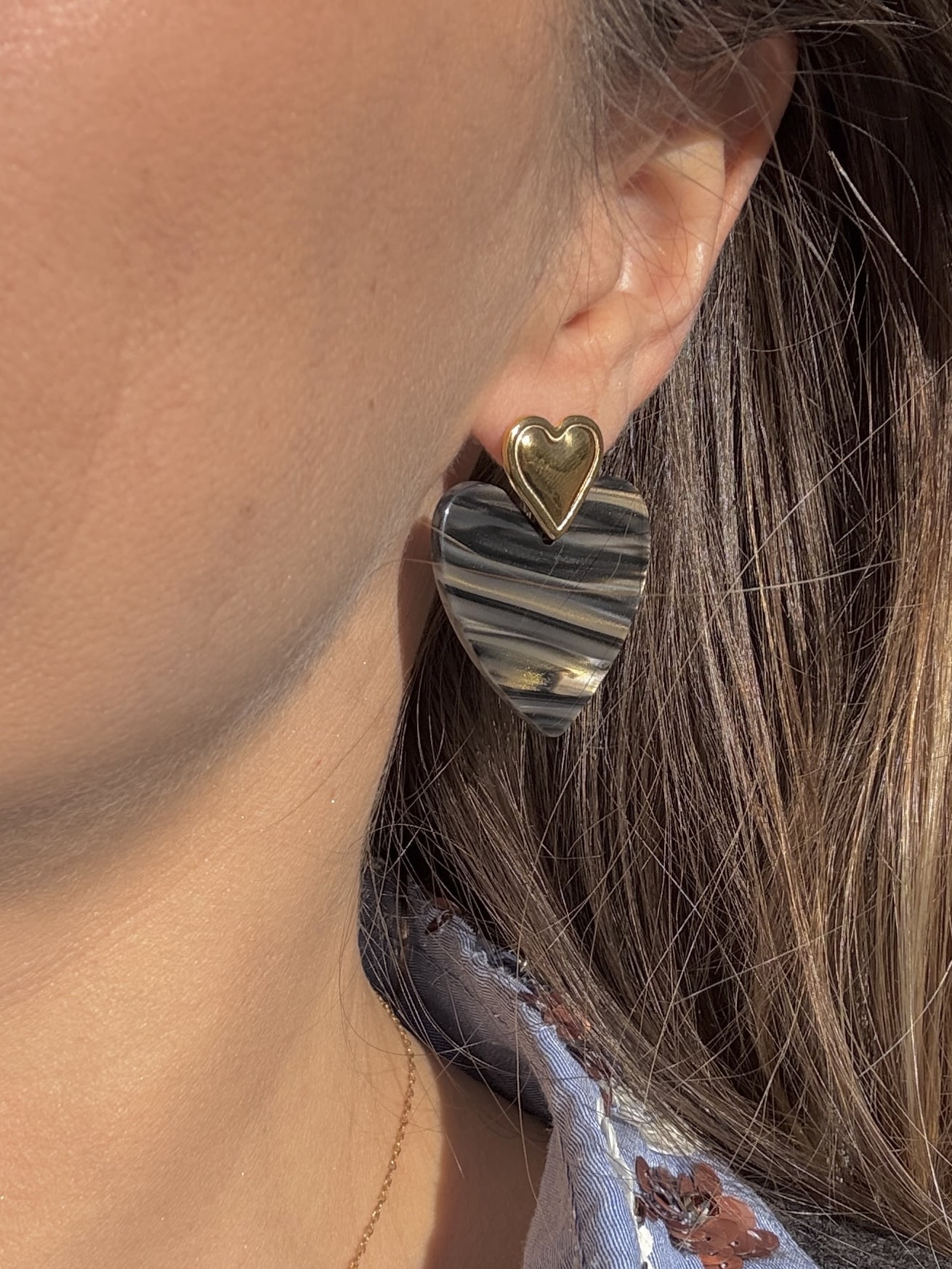 Boucles d’oreilles composées d’un coeur en acier inoxydable doré ainsi que d’un coeur en résine irisée et nacrée avec zèbrures dans les ton de beige et noir: look rock n roll assuré, on adore