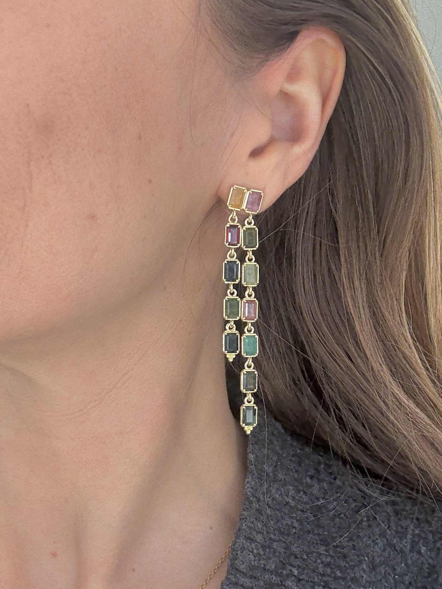 Boucles d’oreilles composées de deux rangs rejoints par la première pierre naturelle sertie. Les deux rangées se séparent ensuite, permettant à ce bijou de suivre vos mouvements tout au long de la journée