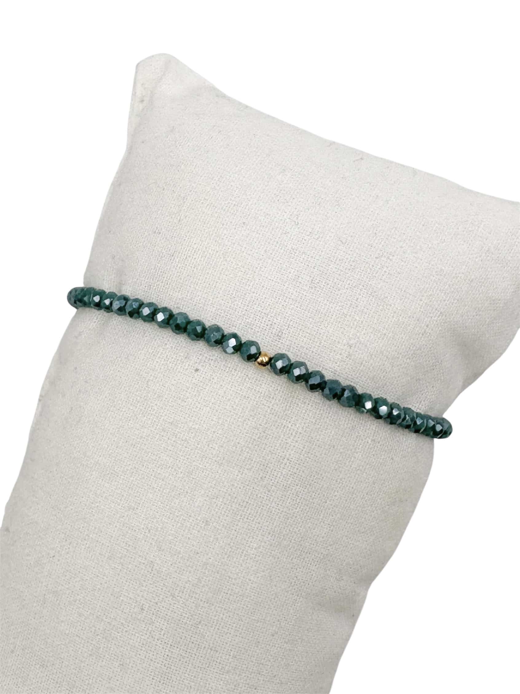 Bracelet composé de perles de verre bleu canard, ainsi que d’une perle en acier inoxydable de couleur dorée