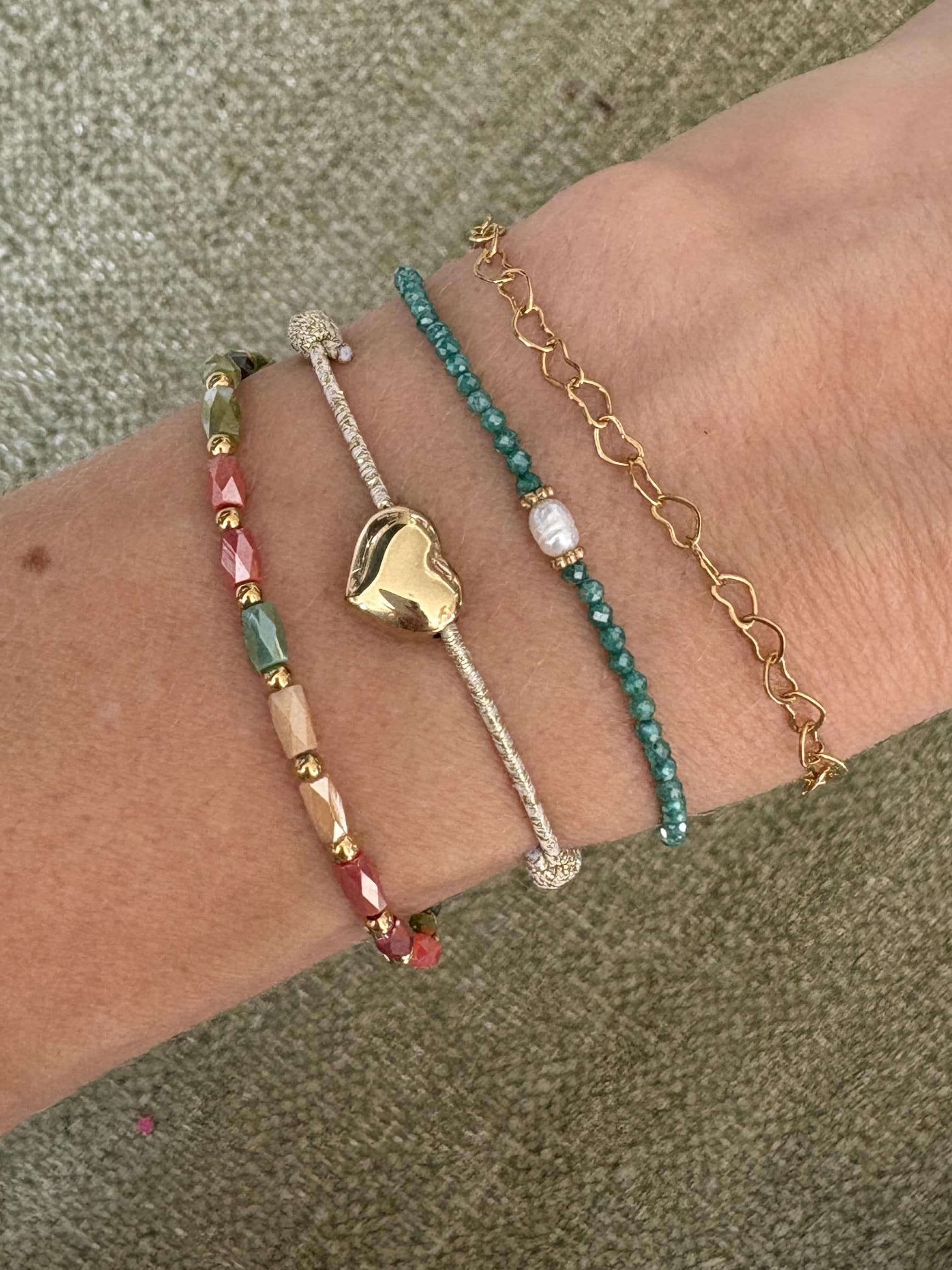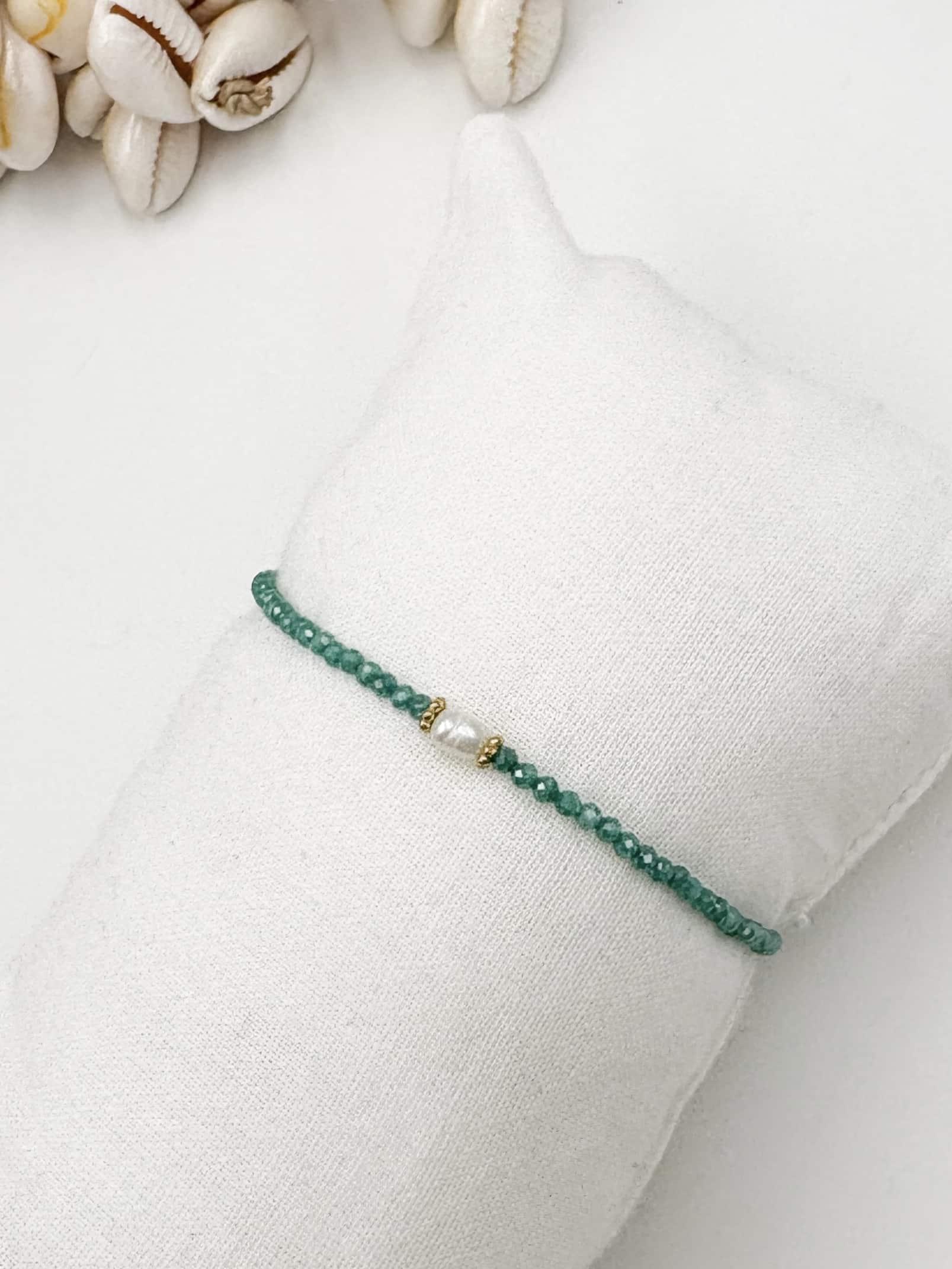 Joli bracelet fait main, ce bijou est composé de petites perles de zirconium vert émeraude ainsi que d’une fine perle d’eau douce véritable et finitions en acier inoxydable doré