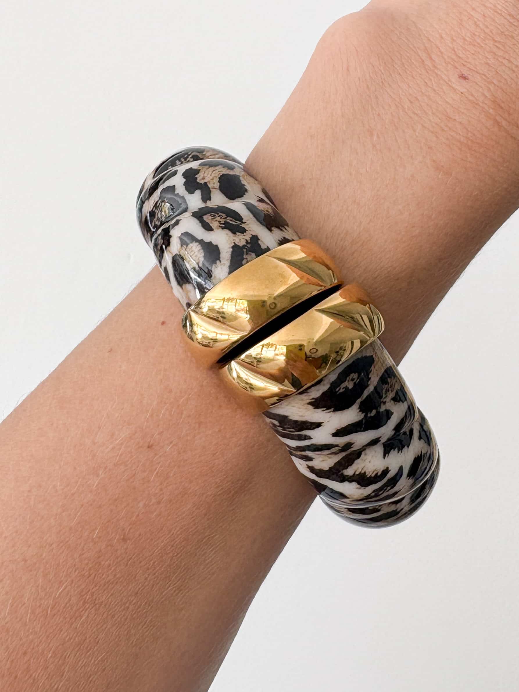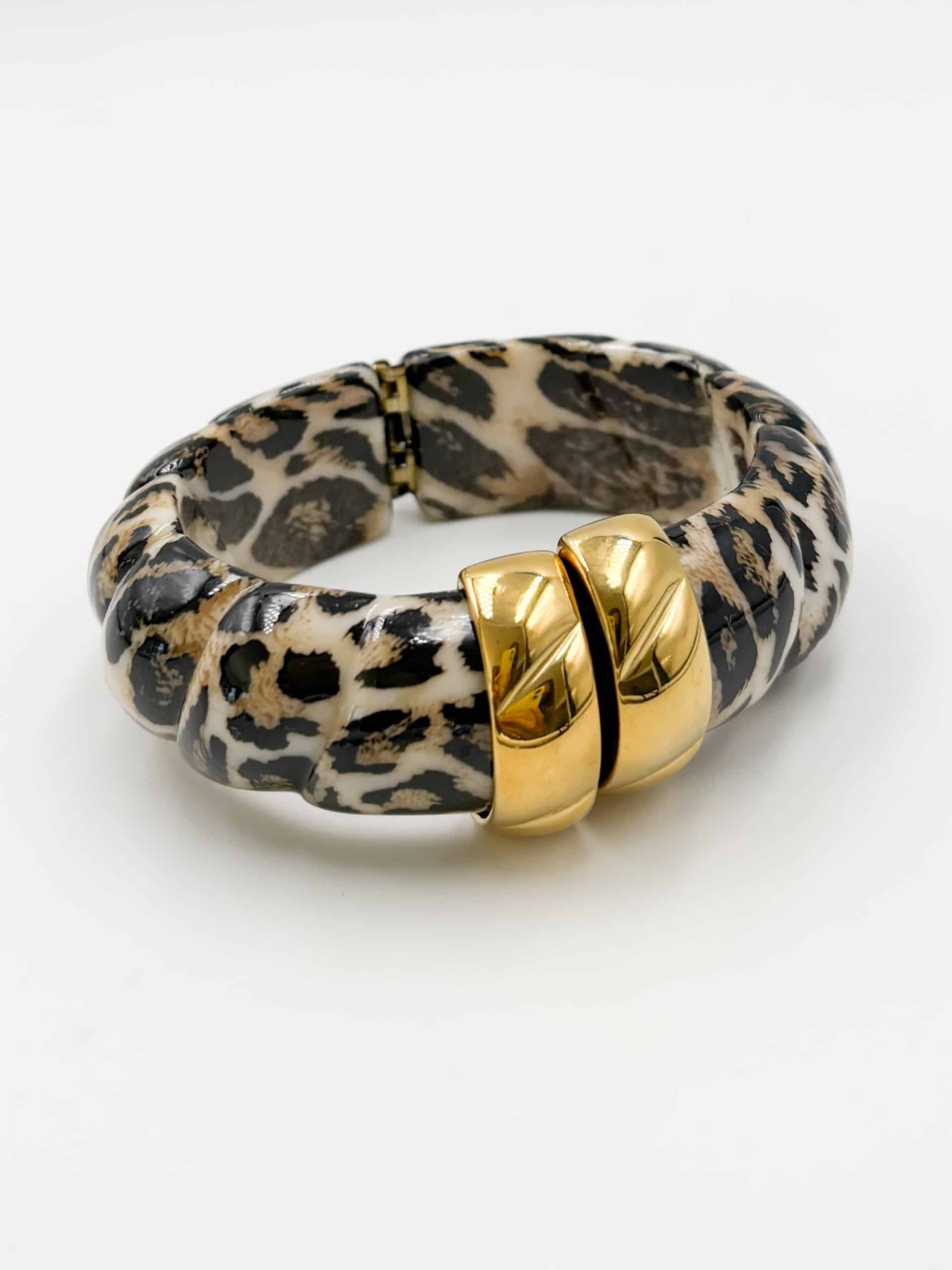 Bracelet torsadé de type jonc, manchette, en acier inoxydable et acétate de couleur léopard.