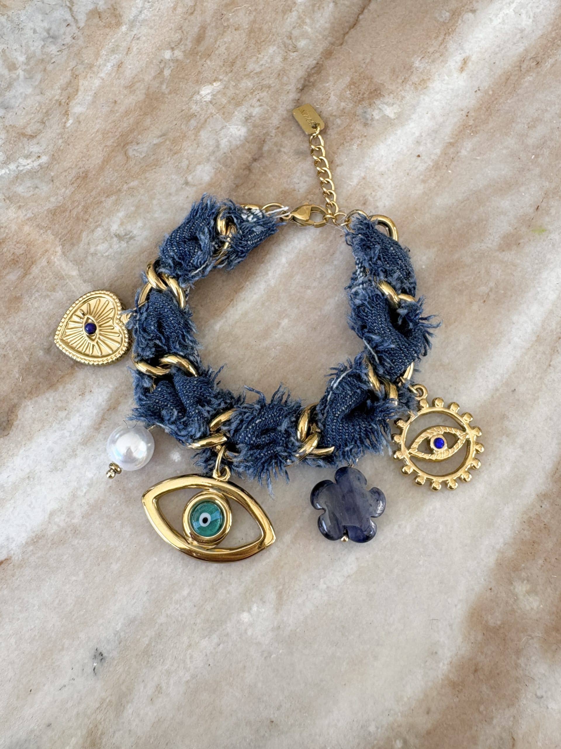 Bracelet rétro à gros maillons travaillés avec une bande de jean entrelacé et pampilles oeil de protection, perles d’eau douce, coeur et trèfle de lapi lazuli – Bijou en acier inoxydable