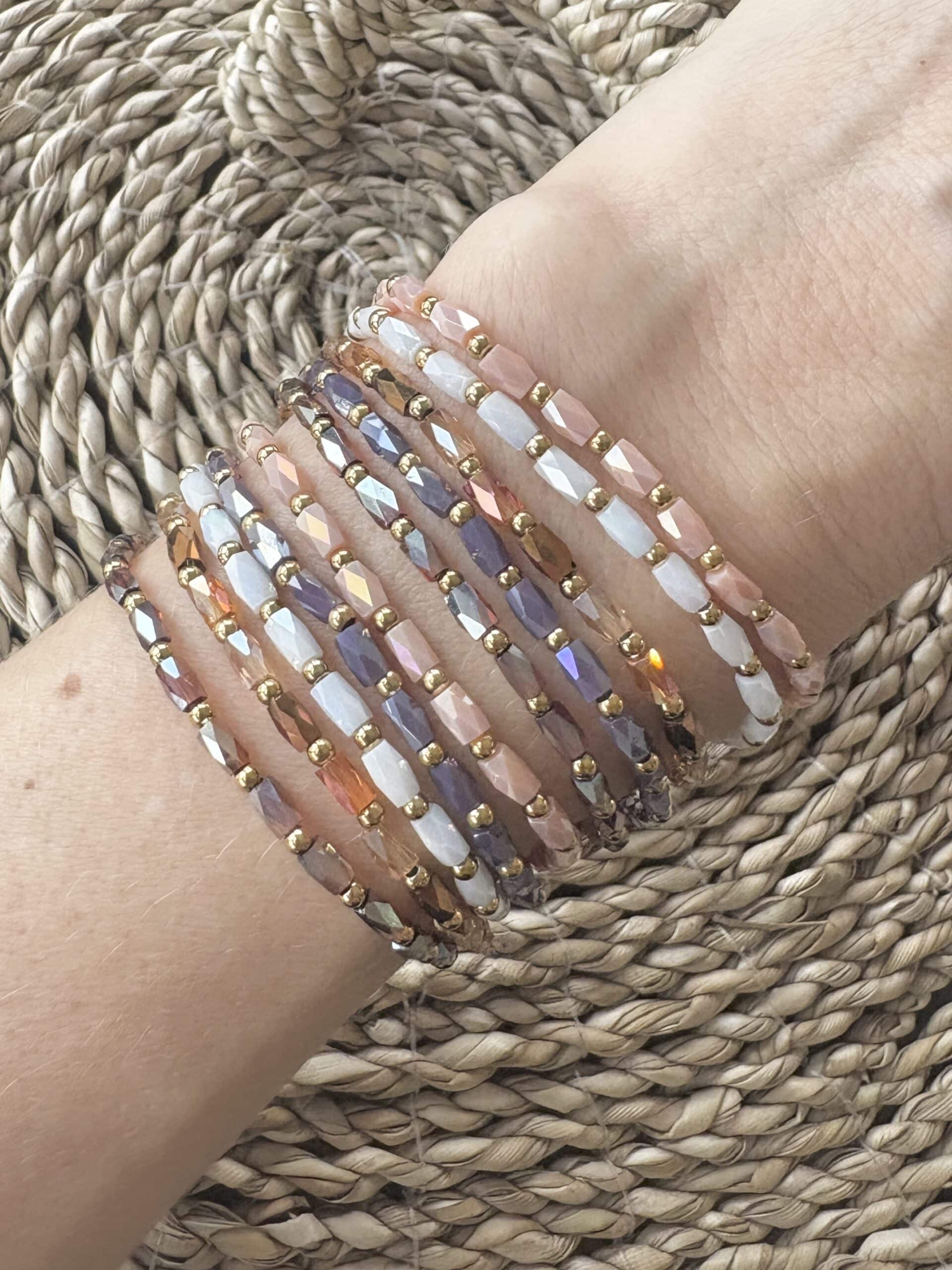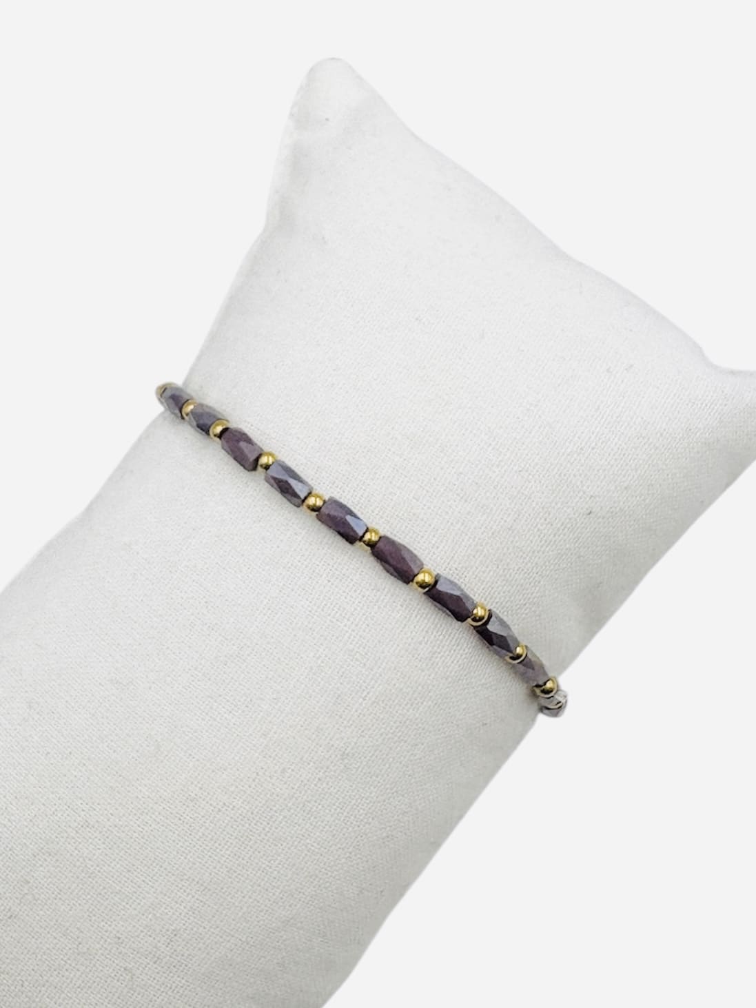 Bracelet monté sur élastique composé de perles de verre de couleur violet et de petites billes en acier inoxydable de couleur dorée
