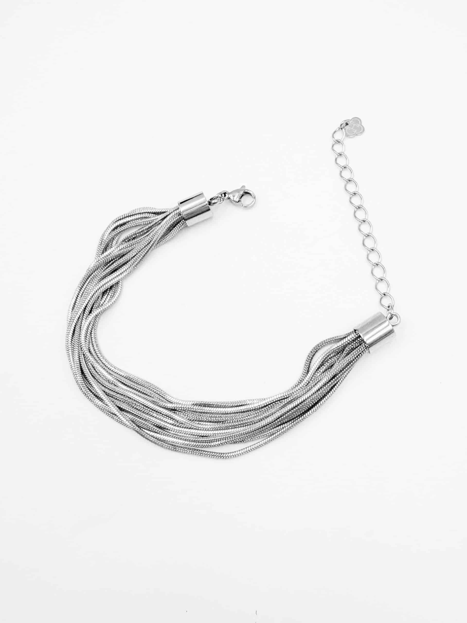 Bijou composé d’une multitude de très fines chaines en acier inoxydable argenté, toutes rejointes en un fermoir unique. Chaines lisses rétro vintage.