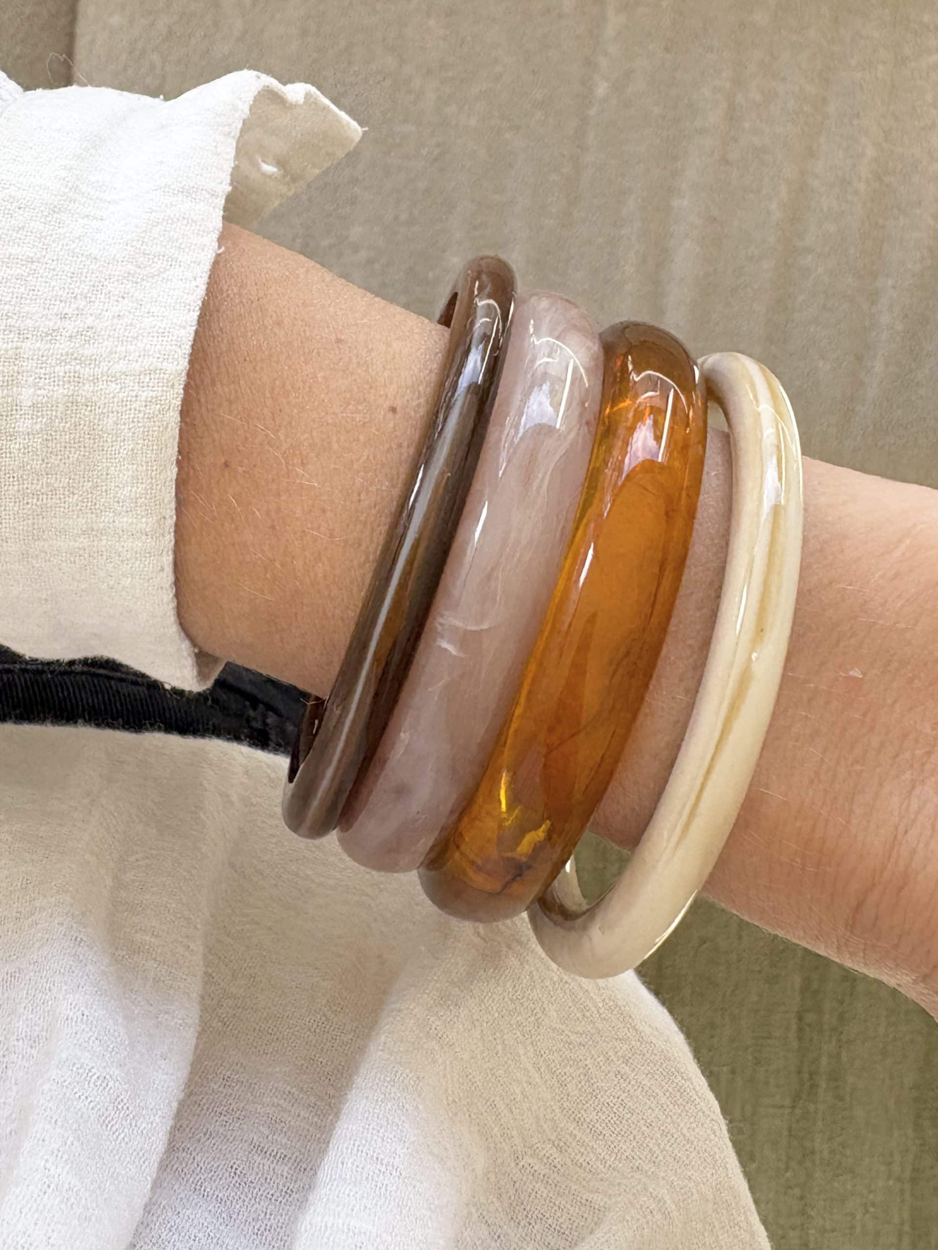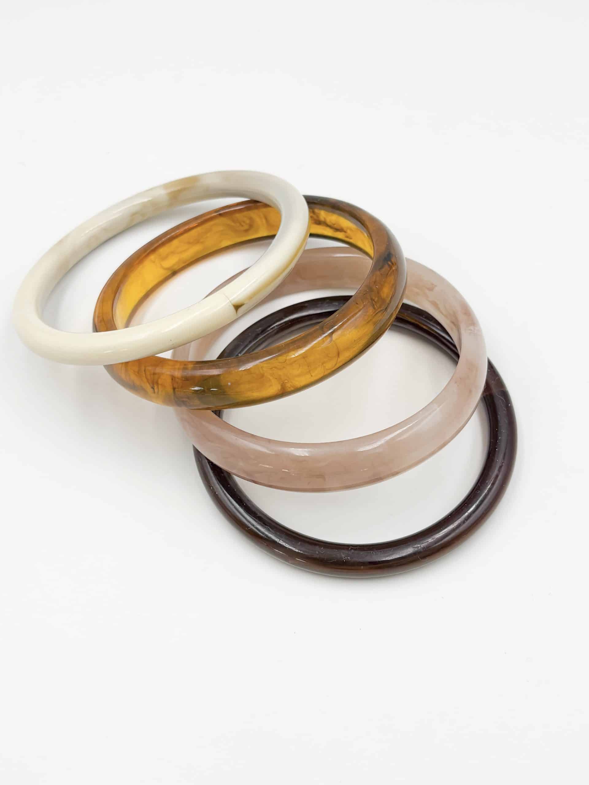 Lot de quatre bracelets à enfiler en acétate de couleur rose pâle, beige, cambre et marron