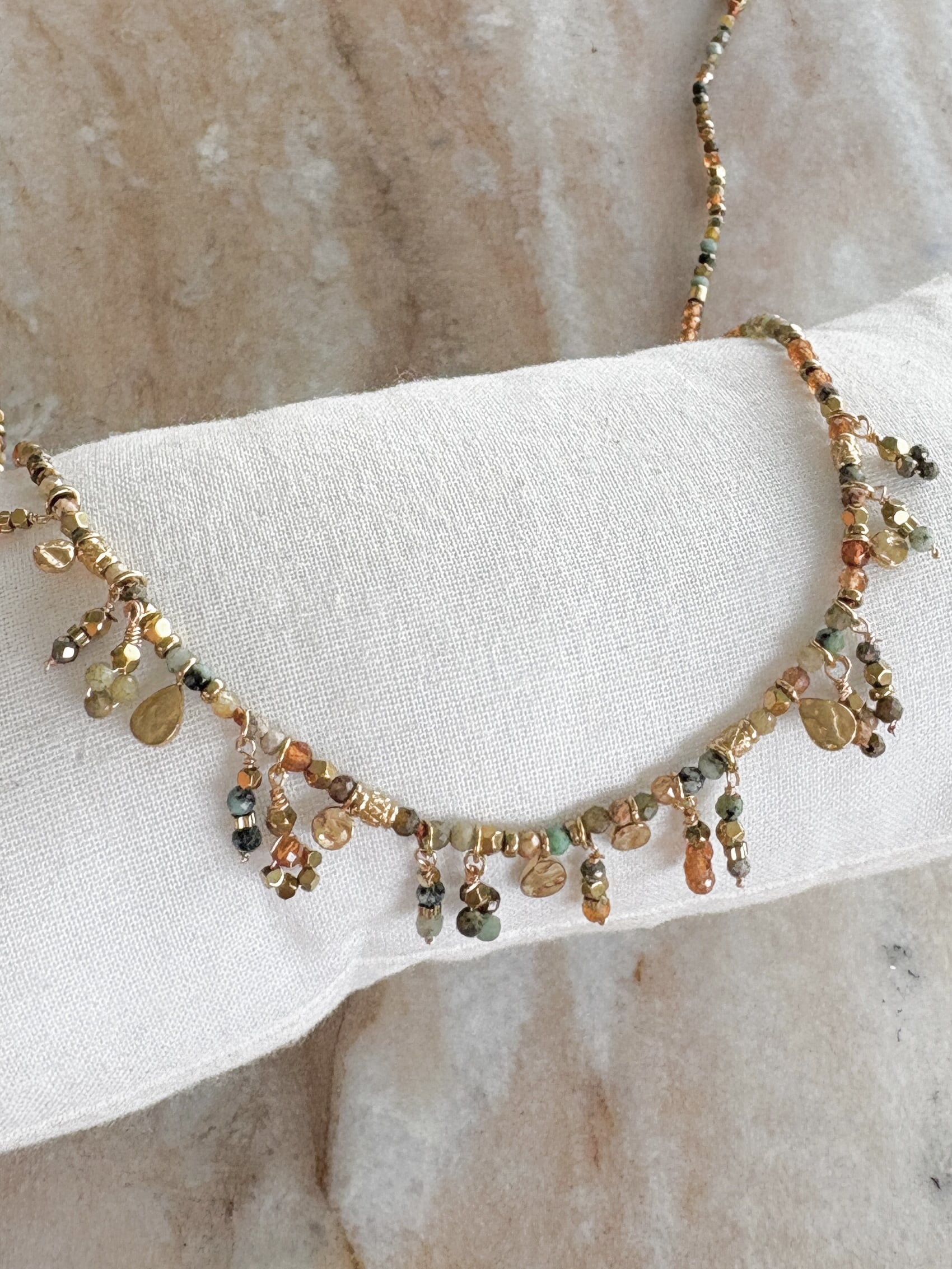 Collier très fin en acier inoxydable doré avec petites pampilles, breloques en acier inoxydable et perles de pierres naturelles – Bijou en acier inoxydable