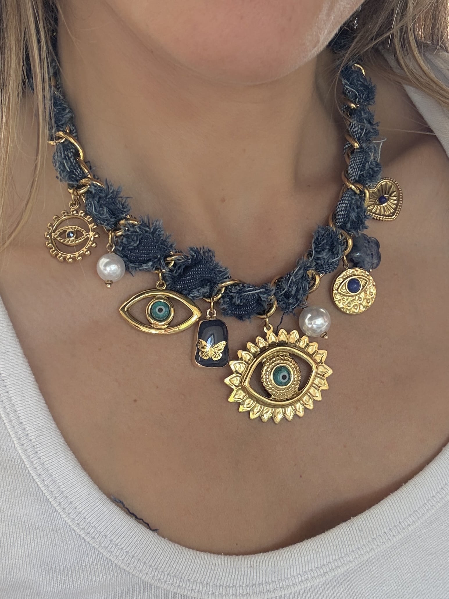 Collier rétro à gros maillons travaillés avec une bande de jean entrelacé et pampilles oeil de protection, perles d’eau douce, papillons, coeur et trèfle de lapi lazuli – Bijou en acier inoxydable
