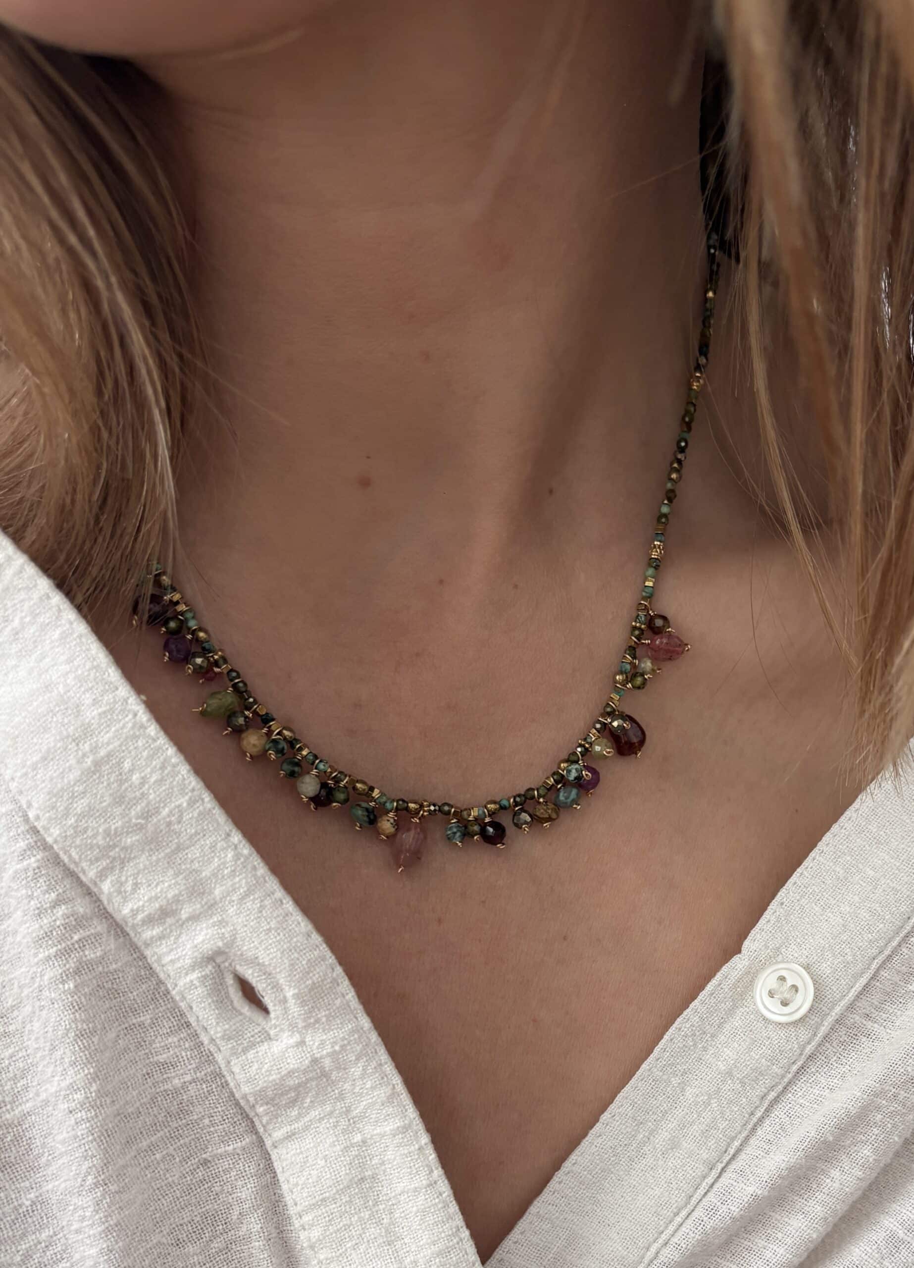 Collier composé d’une multitude de pierres naturelles (pyrithe, oeil du tigre, grenat, amazonite, turquoise africaine, tourmaline)