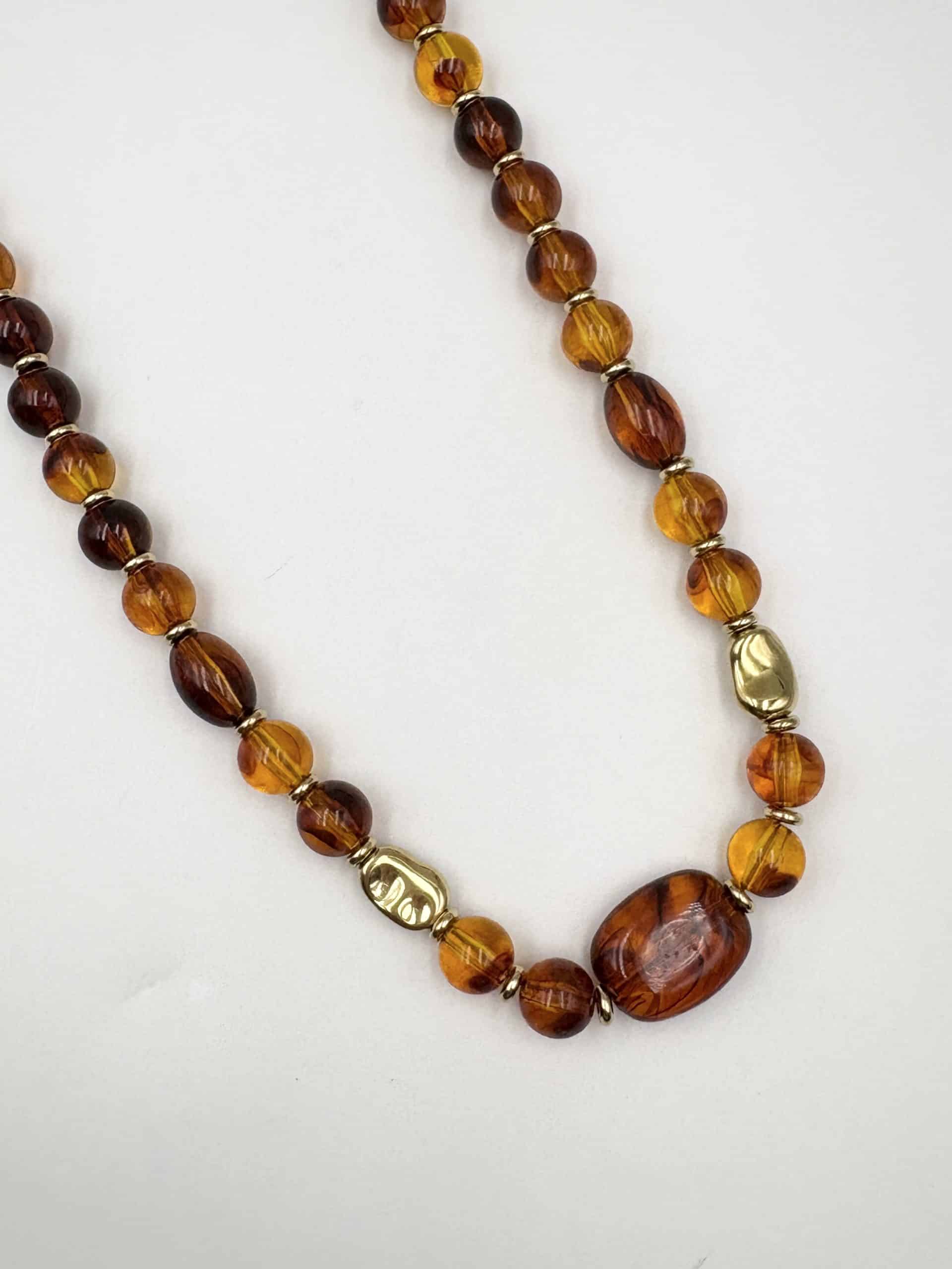 Collier sautoir composé de perles d'acétate de couleur ambre ainsi que de perles d'acier inoxydable