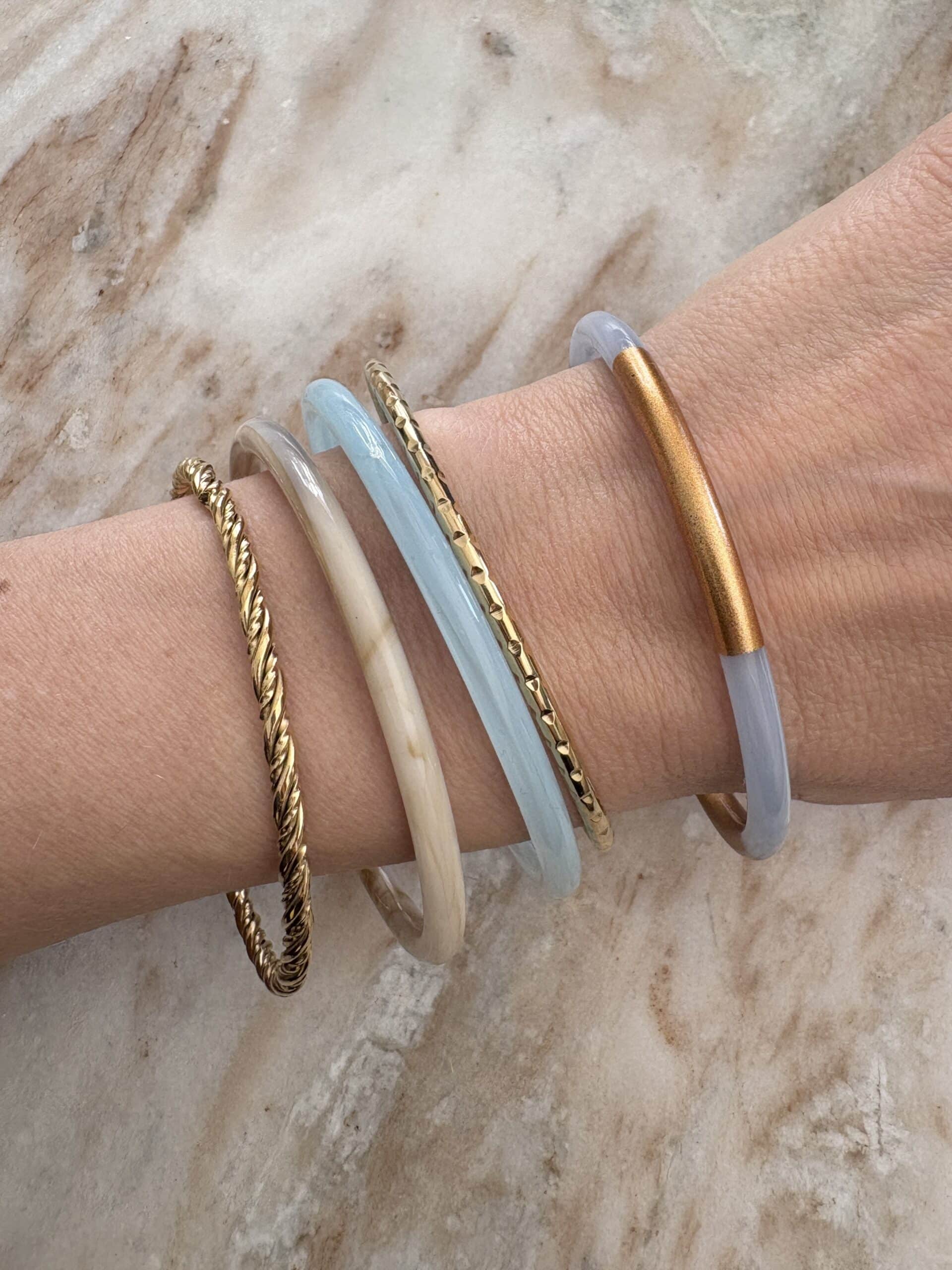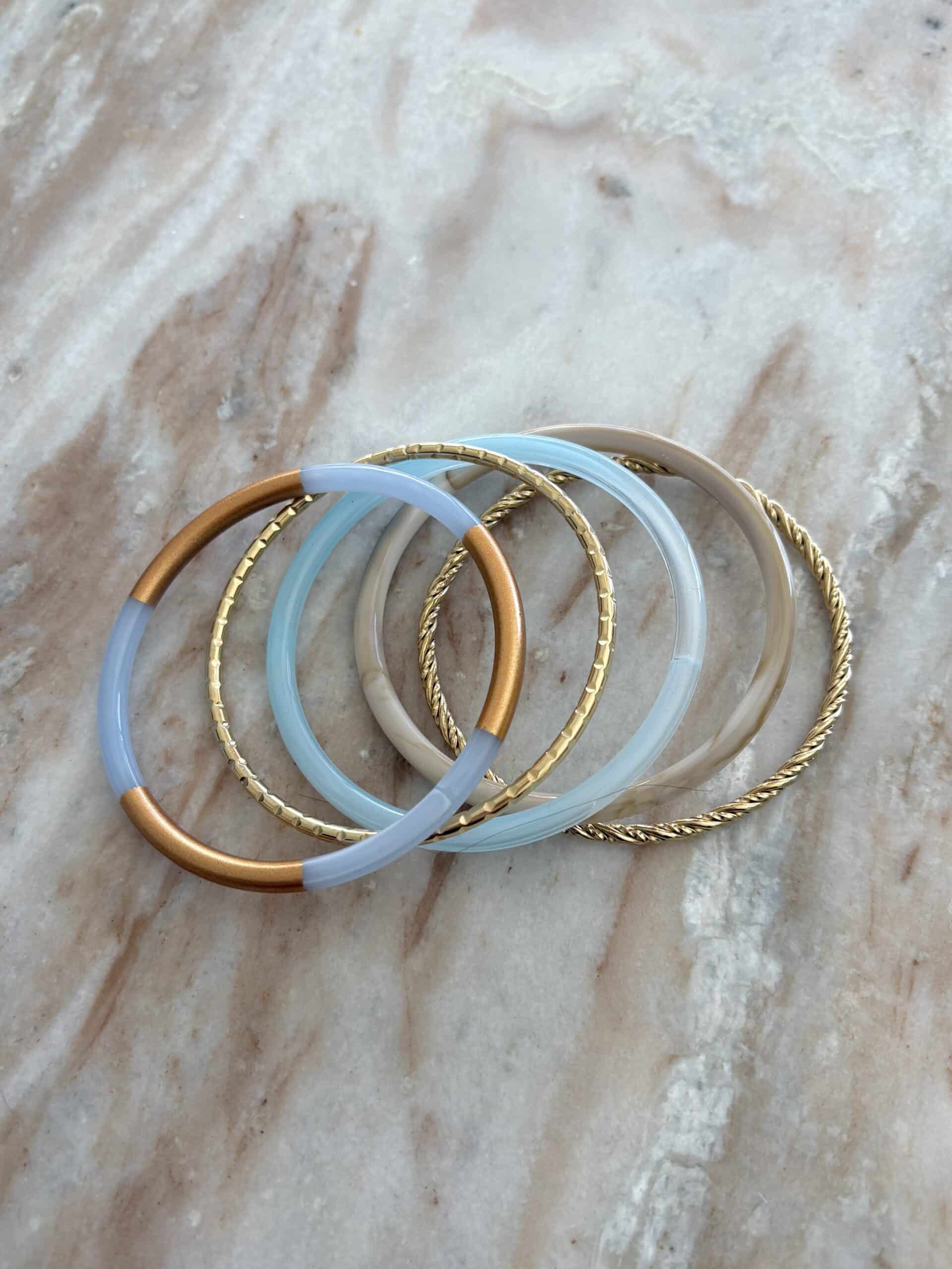 Lot de trois joncs en résine et deux joncs en acier inoxydable doré – Bijou vintage