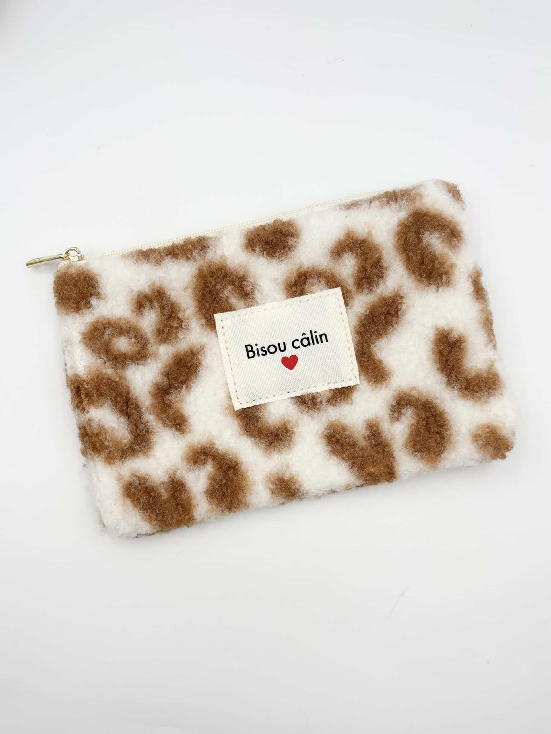 Pochette à message BISOU CALIN à fermeture éclair en PETITES BOUCLETTES à imprimé léopard beige : l’accessoire tendance à adopter !