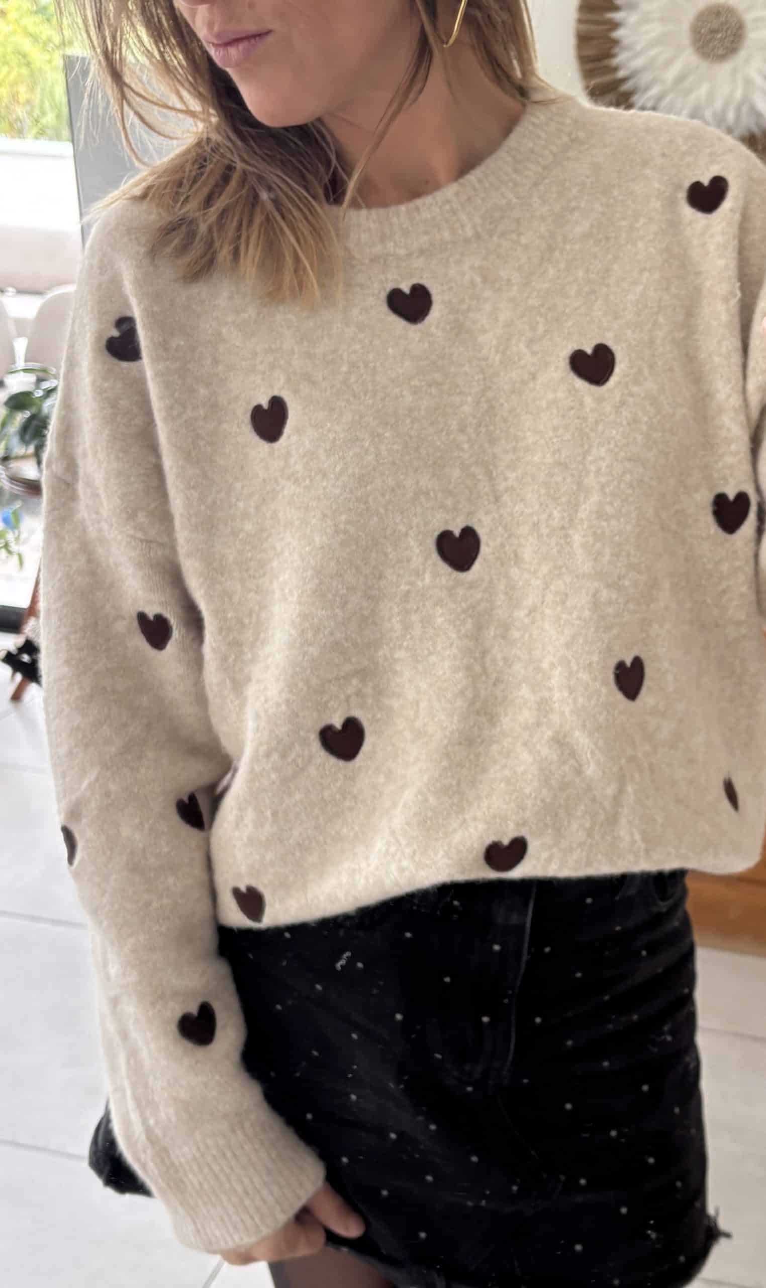 Pull oversize de couleur beige avec broderies coeurs de couleur marron