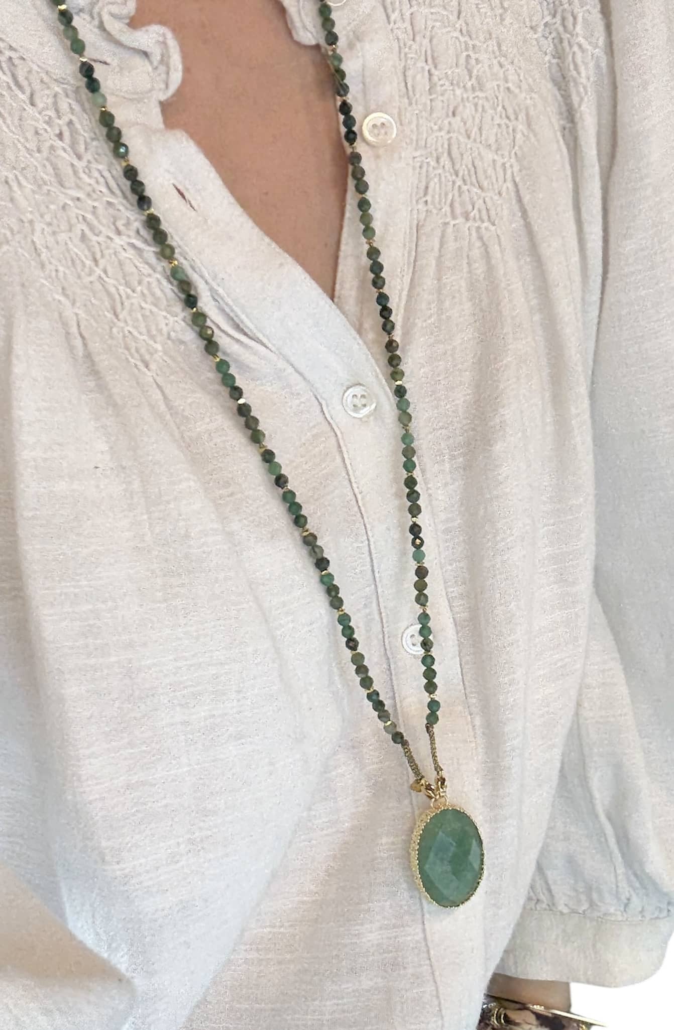 Les pierres naturelles qui composent ce collier offrent non seulement une beauté incomparable, mais aussi une dimension symbolique et énergétique selon les traditions. Chaque sautoir est unique grâce aux variations naturelles des pierres.