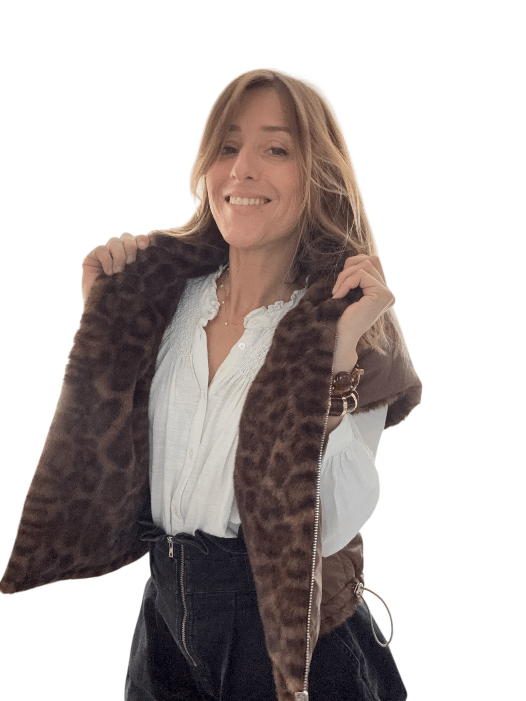 • Veste imitation fourrure réversible: un côté en fourrure léopard, un côté matelassé marron